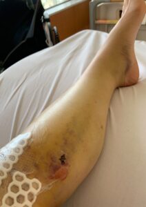 装具をめくるとこんな感じ😨4か所も切って縫ってパンパンの真っ青。