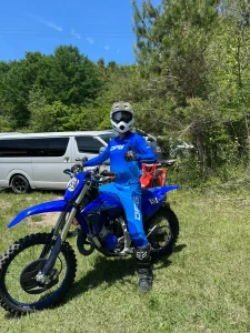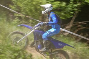 レースでは、YZ125Xというバイクに乗っていてキックスタートしかないのですが、坂の途中で止まってしまうと、かなり無理のある姿勢でキックを蹴ることになるのですが、その時にジャージの伸縮性のおかげでジャージの突っ張りに邪魔されることなくスムーズにリスタート出来た場面が多くありました!
