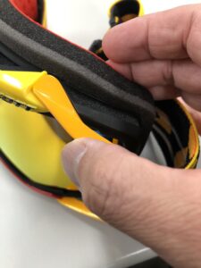 まずゴーグルのフレームを上下につかみ引っ張り割ります。パカっと音がすると思います。その段階ですでにレンズが取り外せます。思い切ってやってみてください。この時の注意はフレームの無いスポンジだけの部分をつかまないことです。スポンジに穴が開いてしまうためです。
