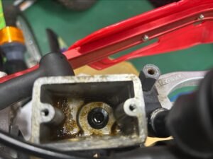 固着したオイルカスが詰まってしまいブレーキが効かなくなるのでしっかり取り除きます!