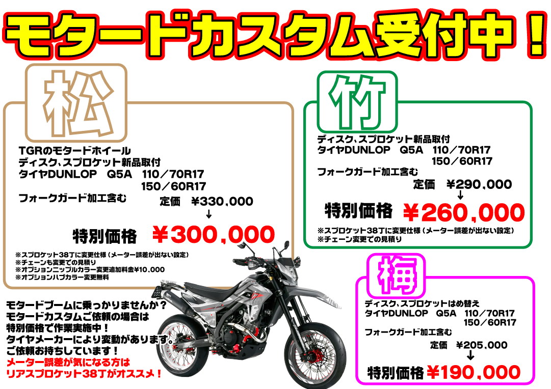 モタードカスタム最安値メニューです。
