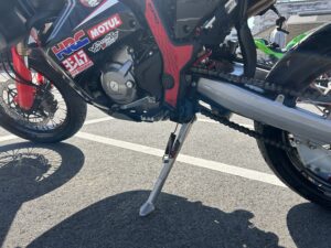モタードホイールの為、車高が下がってしまいスタンドを出しても直立気味でしたので