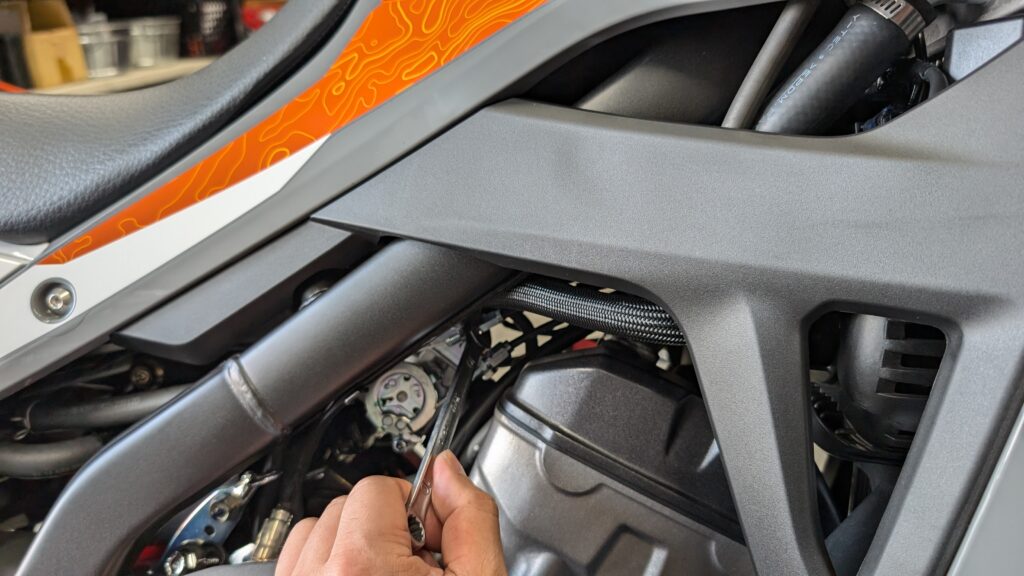 10mmのスパナで引き側のワイヤーを緩めて外してください。