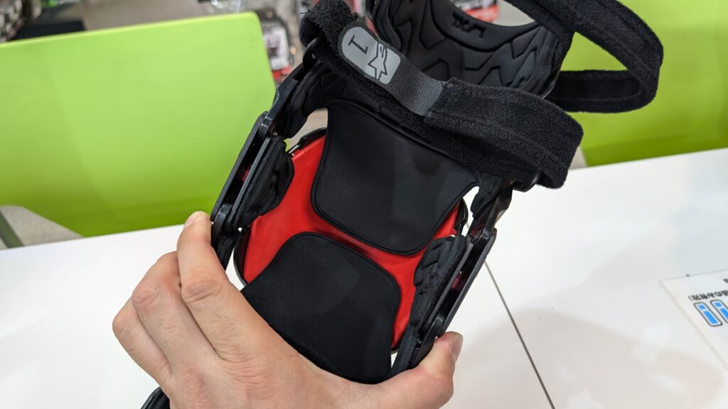 アルパインスターズのニーブレース伝統のギミックとして、膝カップがゴムバンドで固定されていて