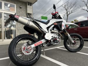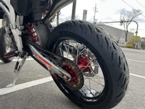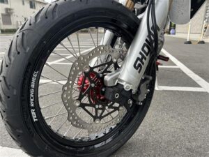 モタードホイールの定番カスタムとして大径ディスクに変更しています。