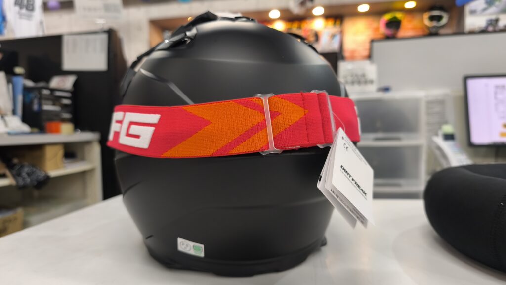 シールドベースも平面的な形状なので、やはりゴーグルのストラップに干渉しないようになっています。