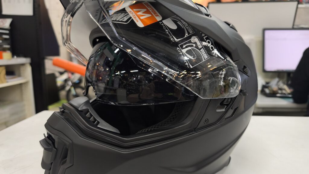 通常シールド付きヘルメットはバイザーがシールドのホルダーを兼ねているので