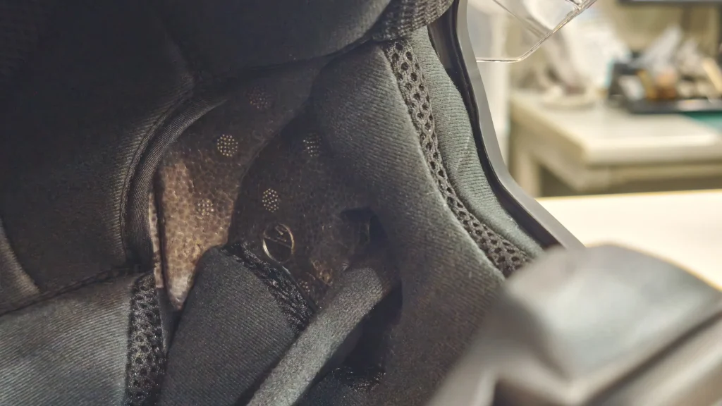 内装はストラップカバーを除いたセンターパッドとチークパッドが着脱可能。