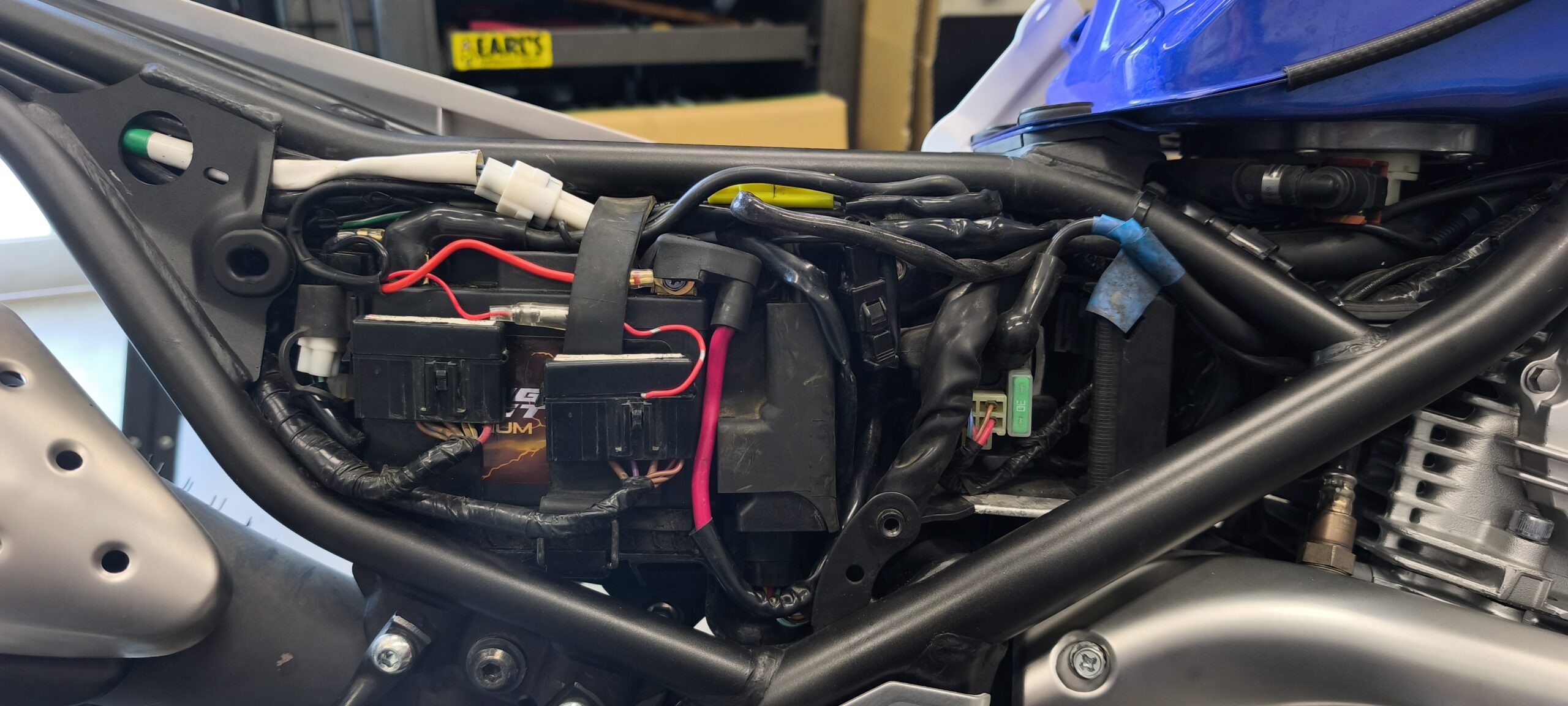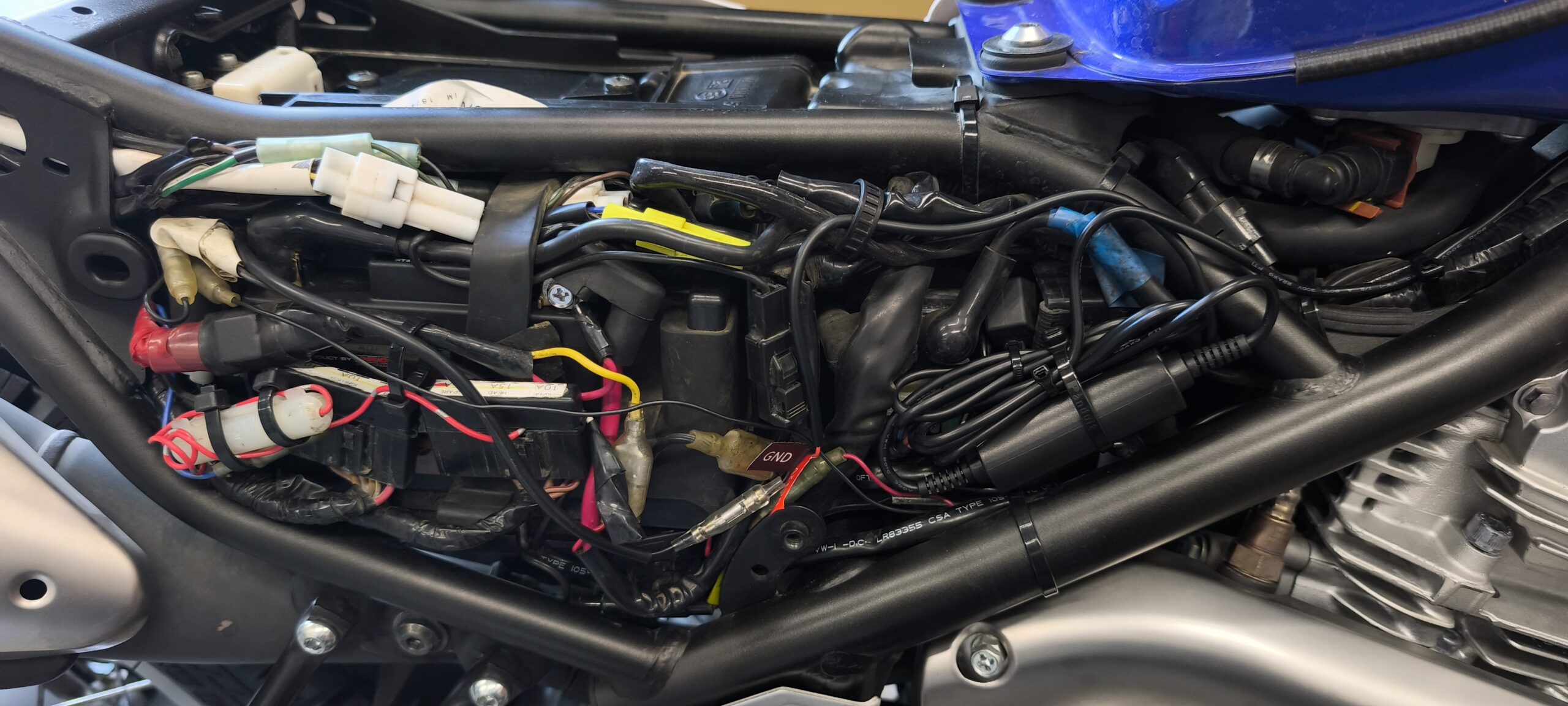 セロー250のバッテリー交換の際、配線がゴチャゴチャしているのでスッキリさせて欲しいとのオーダーを頂きました。