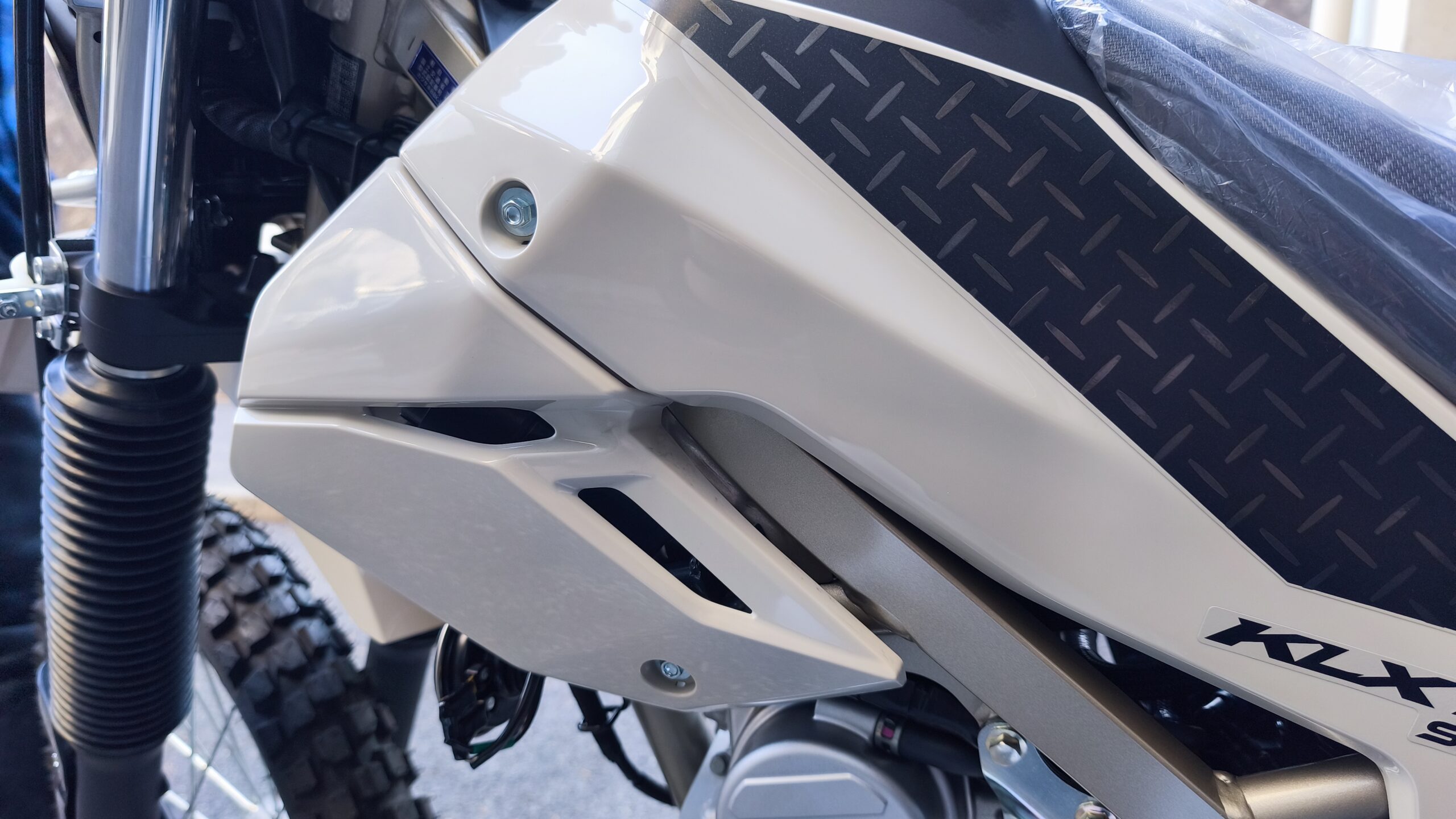 前方に延びる形状だったKLX230に対し、少し短めに抑えたシュラウド。