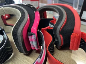 OTGゴーグルは顔に接地するスポンジからレンズまでの幅を広く取り、ゴーグルを装着した際にメガネを圧迫しにくい構造になっていて、さまざまな形のメガネに対応可能