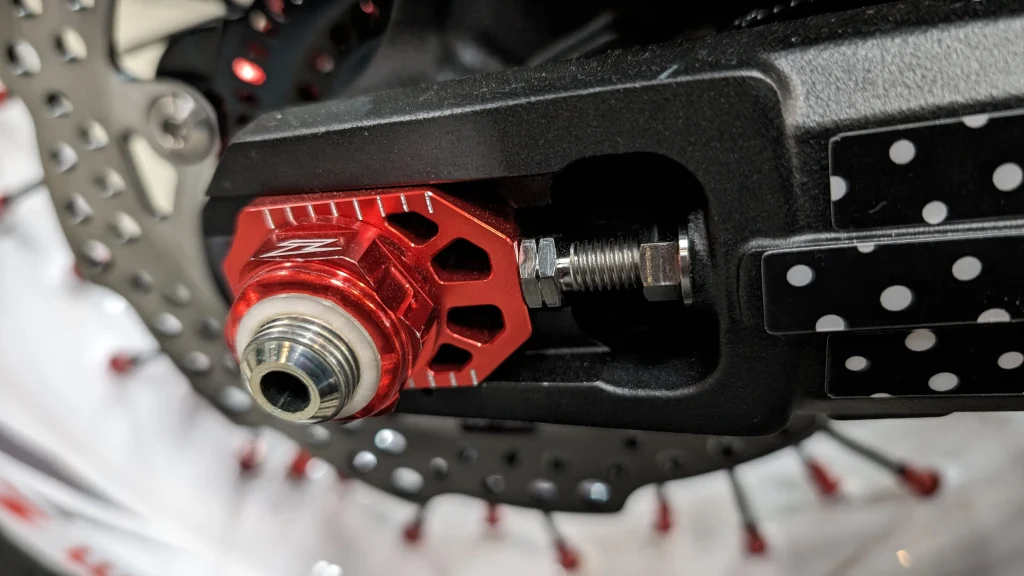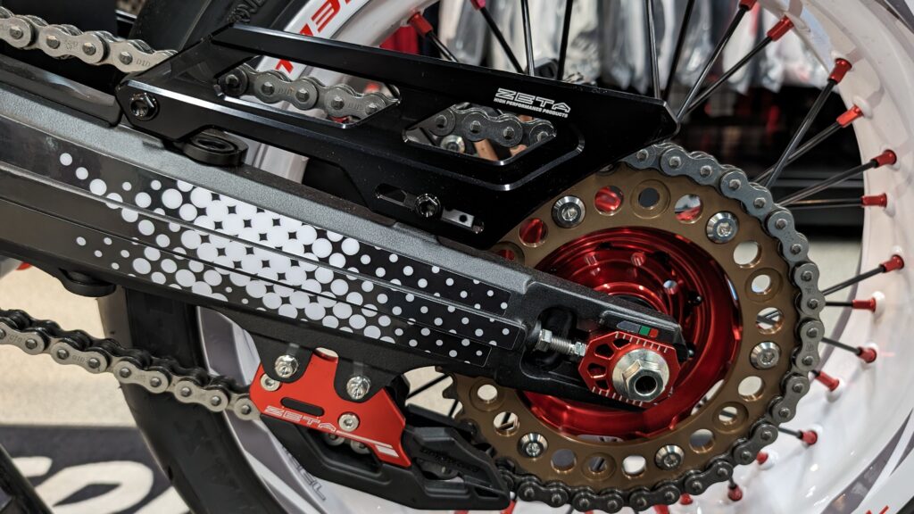 スイングアーム上にはヒールガード、下にはチェーンガイドを装着。どちらももちろんZETAです。