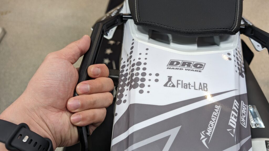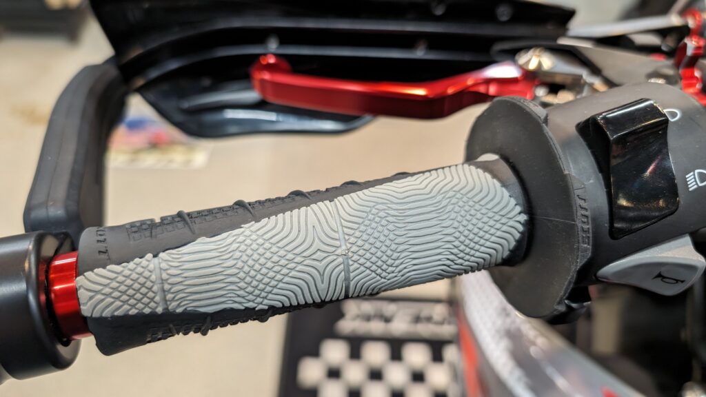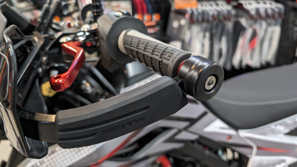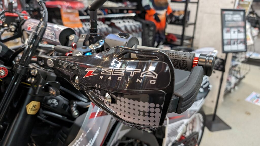 まずはお約束のハンドガード。モタードにはクローズドエンドのアルミハンドガードがマストですね。