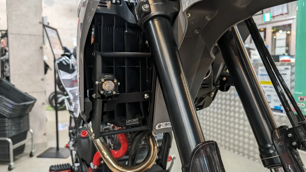 そして、エンジンから少し視線をズラすとZETAから発売予定のフォグランプが見えます。