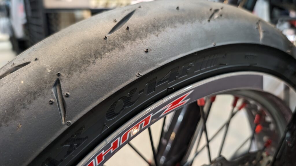 タイヤはDUNLOPのα-14です。モデル末期ですがスポーツ走行の好むライダーからは評判の良いタイヤでした。