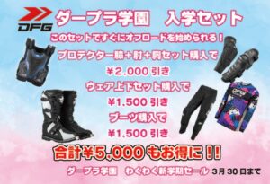 ダープラ学園 入学セットというのもあります。これさえあればすぐにオフロードを始められるSETをそろえて頂くと、5000円も割引に!