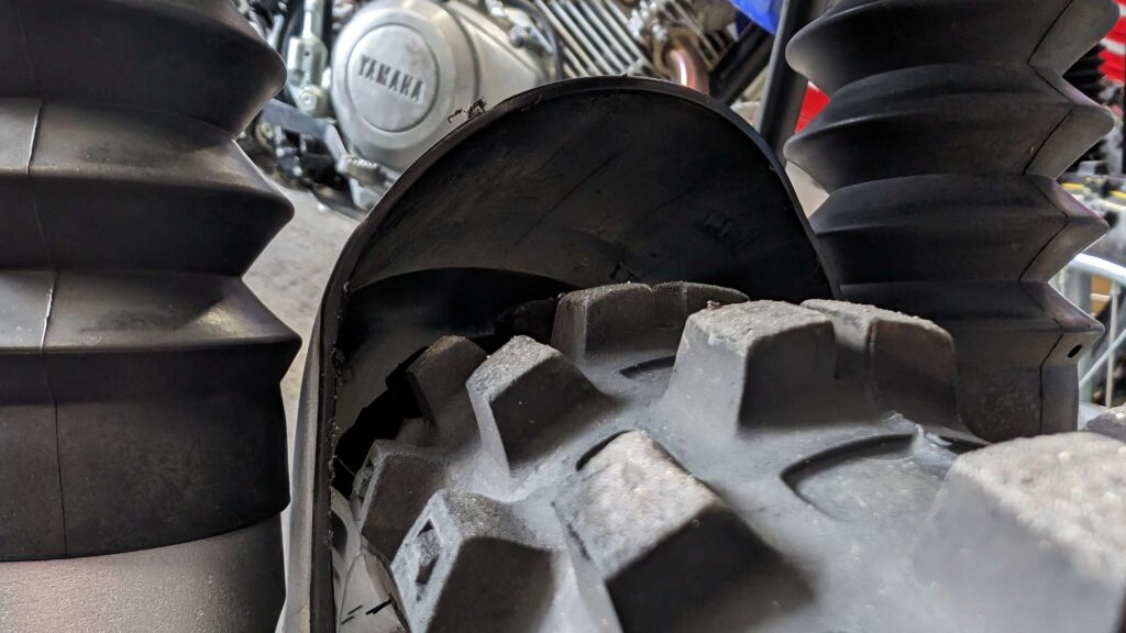 フロントフェンダー(後部)とのクリアランスが少ないので泥つまりが心配になりますが、