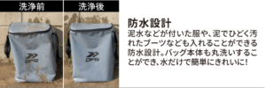 WPマルチギアバックは名前の通り防水仕様で、雨などから内容物を守ってくれるのですが、その防水性を使ってバッグの中で予洗いすることが出来ます!